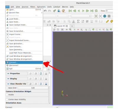 Desde la PC local, ejecutar el programa ParaView, que se utilizará como cliente. Luego, ir al menú “File” y seleccionar la opción “Connect…”.